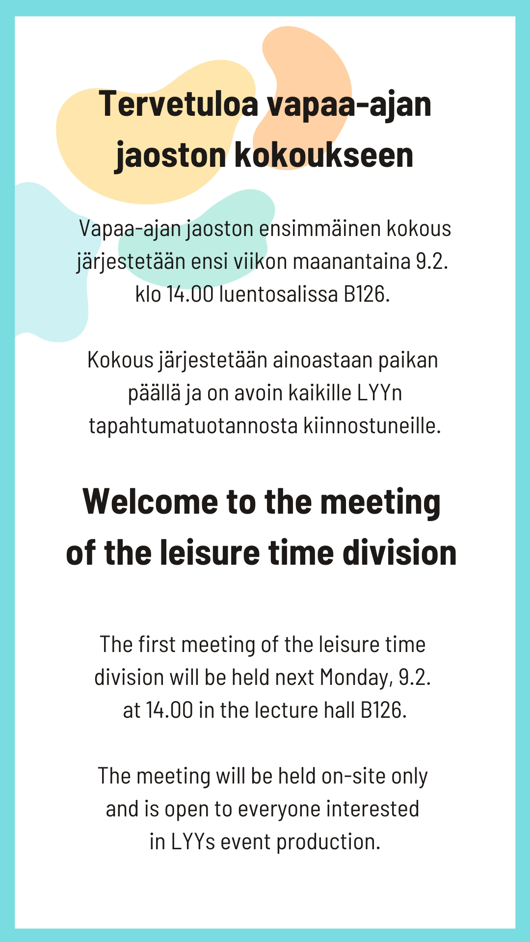 • LYYn vapaa-ajan jaoston kokous / Meeting of LYYs leisure time division