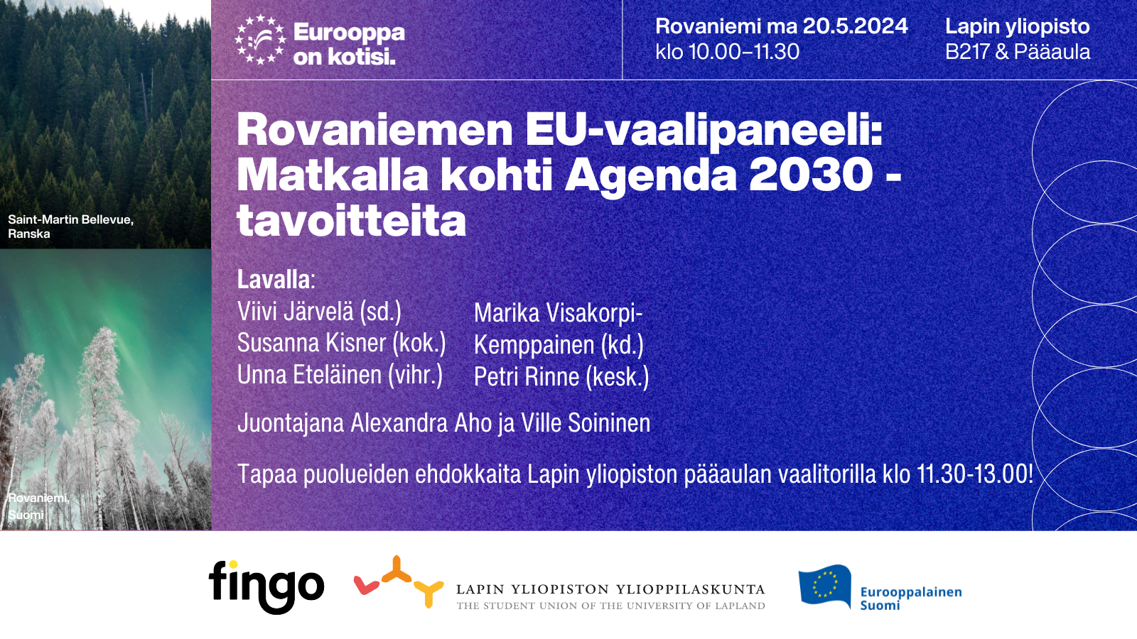 Eurooppa on kotisi kiertue rantautuu Rovaniemelle 20.5.2024 meppiehdokaspaneelilla, jossa lavalla tentattavana nähdään Viivi Järvelä (sd.), Unna Eteläinen (vihr.), Marika Visakorpi-Kemppainen (kd.), Susanna Kisner (kok.), Petri Rinne (kesk.) sekä TBC (ps.). Moderaattoreina toimivat Alexandra Aho ja Ville Soininen.