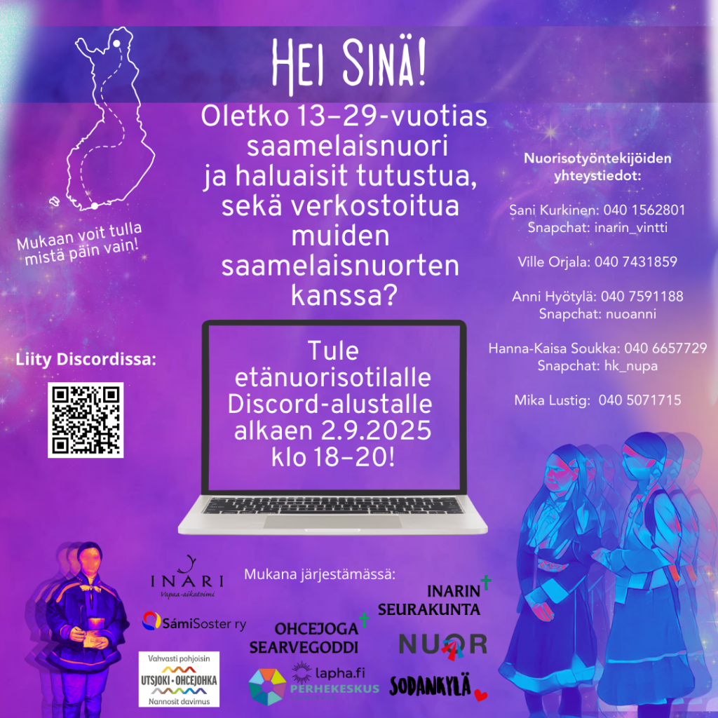 Lapha, kunnat ja saamelaisjärjestöt ovat käynnistämässä etänuorisotilaa Discord-alustalla, jonka kohderyhmänä ovat 13-29-vuotiaat saamelaisnuoret ympäri Suomen. Olisiko teillä mahdollista jakaa … [Lue lisää...] tietoaSaamelaisnuorten etänuorisotila Discordissa